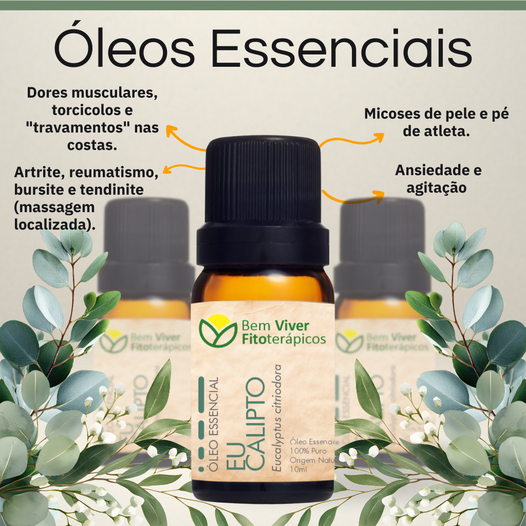 Alívio profundo para suas dores e proteção natural com o Óleo Essencial de Eucalipto Citriodora 10ml! Muito mais que um aroma agradável, é a solução da natureza para dores no corpo e inflamações. O companheiro ideal para atletas, idosos e amantes da vida ao ar livre. Compre agora em nosso site e sinta o poder desinflamatório em sua pele. 🍋🌿